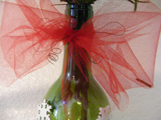 So this week I am going to share ideas you can use for a stress free New Year's Eve party. Starting with this wine bottle center piece. I know I am pinching pennies over here after Christmas shopping. The last thing I can do is purchase a costly floral arrangement for New Years Eve. So what I have done is taken some branches from my Christmas tree and placed them in a green wine bottle. I cleaned the wine bottle off first. I used rubbing alcohol and hot water to get it clean and sticky free. Then after it was dry, I hot glued some leftover plastic snowflakes to it. You can find these flakes at Walmart for a dollar. Then I decorated it with some tulle and some green floral wire. You will want to fill it with water, so your tree branches don't dry out.
